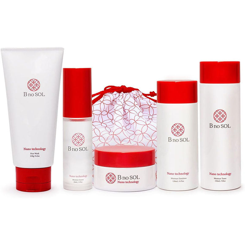 Wクレンジングジェル・化粧水・乳液・美容液・クリーム、BnoSOLのフルラインをお得に揃えられる5点セット。使いやすくてかわいい巾着ポーチ付き!