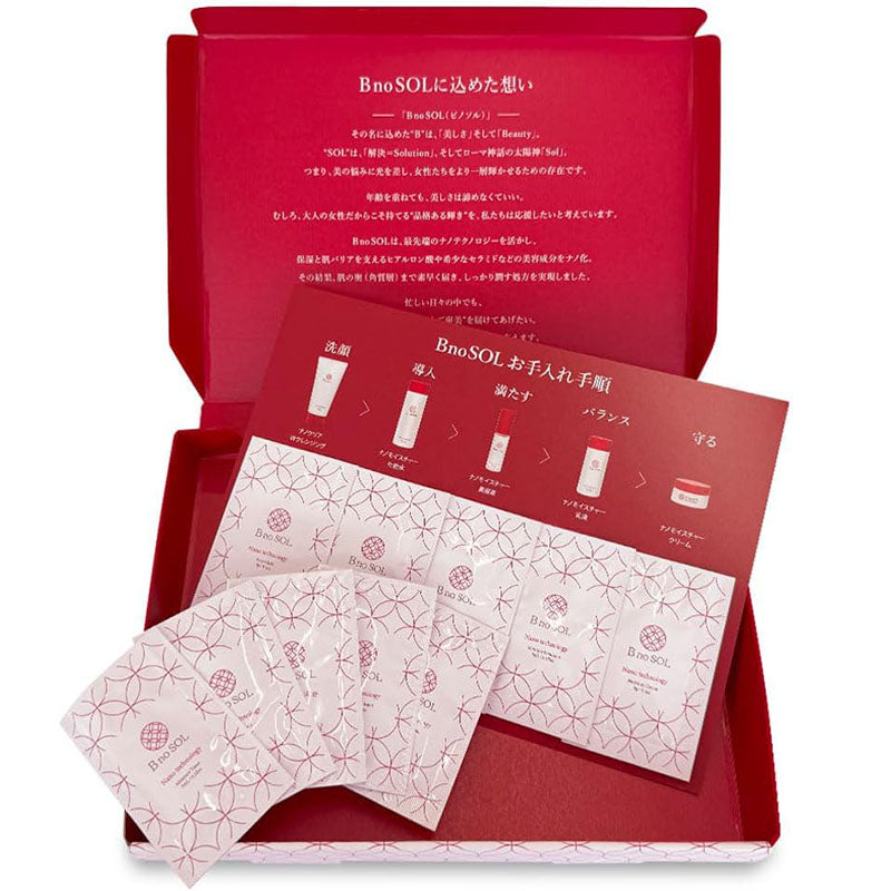 内容量:化粧水、乳液、美容液(各3ml) / Wクレンジングジェル、クリーム(各3g) BnoSOL(ビノソル) は最先端のナノテクノロジーで、肌の保湿・バリア機能を支えるヒアルロン酸や、希少なセラミドなどの美容成分をナノ化。角質層まで素早く届き、しっかり潤う、特別な配合を実現しました。